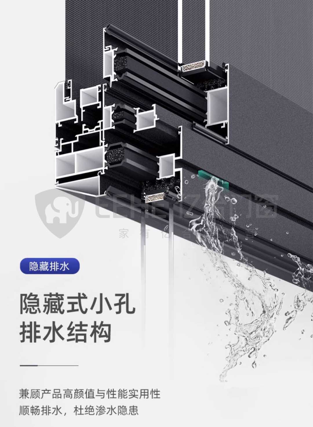 面臨暴雨天氣時,如果門窗排水結構設計不合理,則很容易出現雨水倒灌進入室內的情況。億合門窗以用戶日常使用需求為核心,全方位、多角度地對產品細節進行升級與完善,采用腔內式隱藏排水結構,將排水路徑隱藏于整窗外框里,避免大風直吹造成雨水倒灌室內,不僅達到平整美觀度,更有效幫助迅速排水,哪怕在面對暴雨襲擊時,也能做到“滴水不滲”。