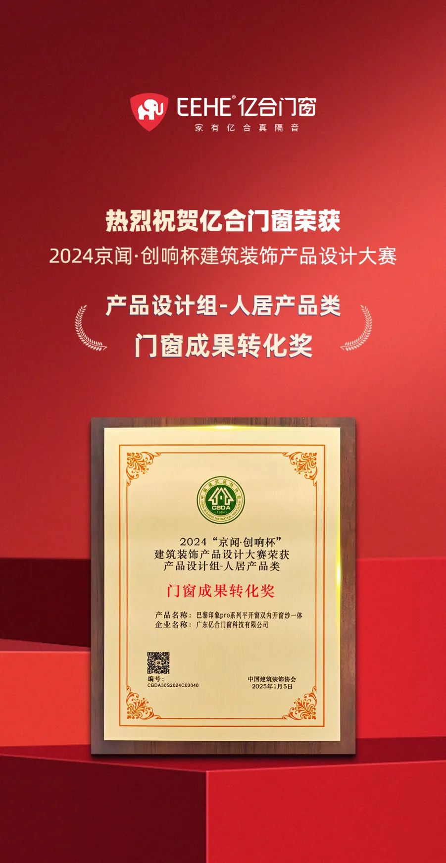 2024“京聞·創響杯”建筑裝飾產品設計大賽是由中國建筑裝飾協會主辦,中國建筑裝飾協會材料應用分會、廣東京聞傳媒有限公司承辦的重量級賽事。經專家組的深入考察,億合門窗憑借創新的產品設計和卓越的產品品質,榮獲“門窗成果轉化獎”。會上,大賽專家考察團為億合門窗頒獎,共同見證榮耀時刻。這一殊榮不僅彰顯了億合門窗在設計與技術上的雄厚實力,也體現了行業對億合門窗深耕品牌建設和產品創新設計領域的高度認可。
