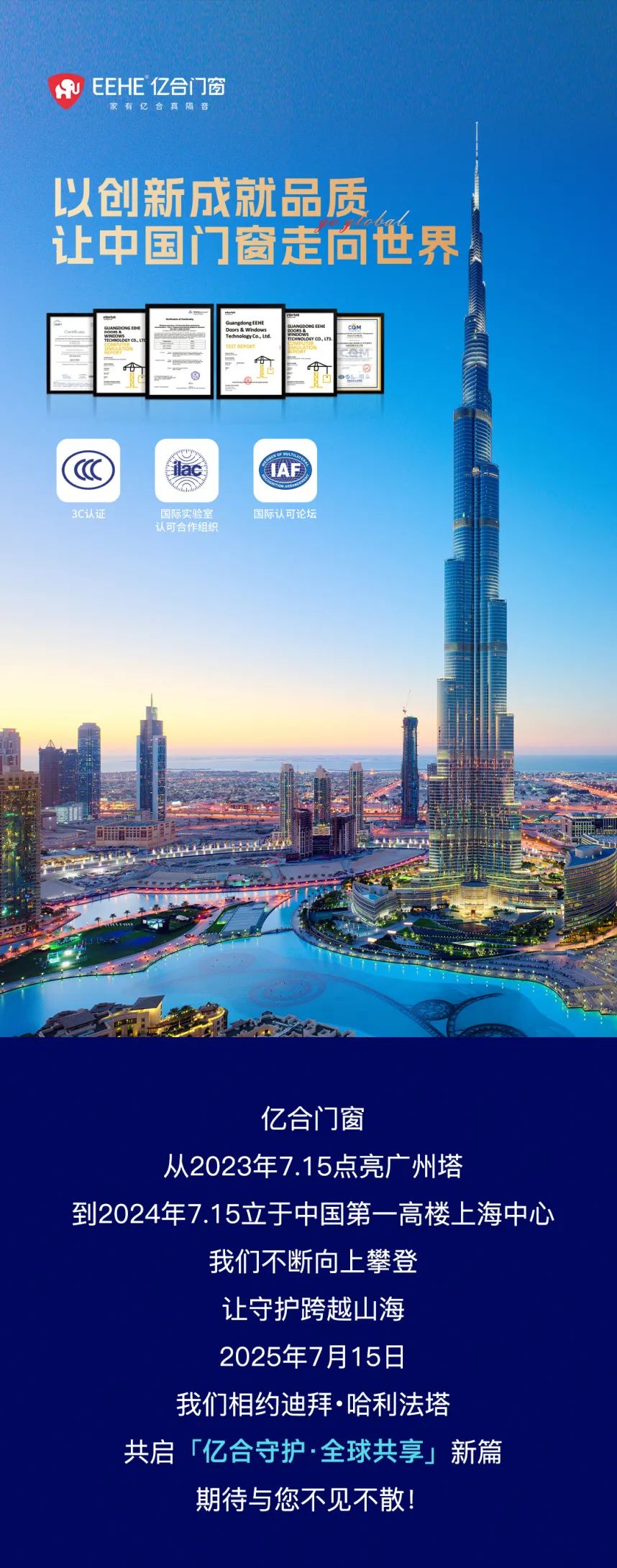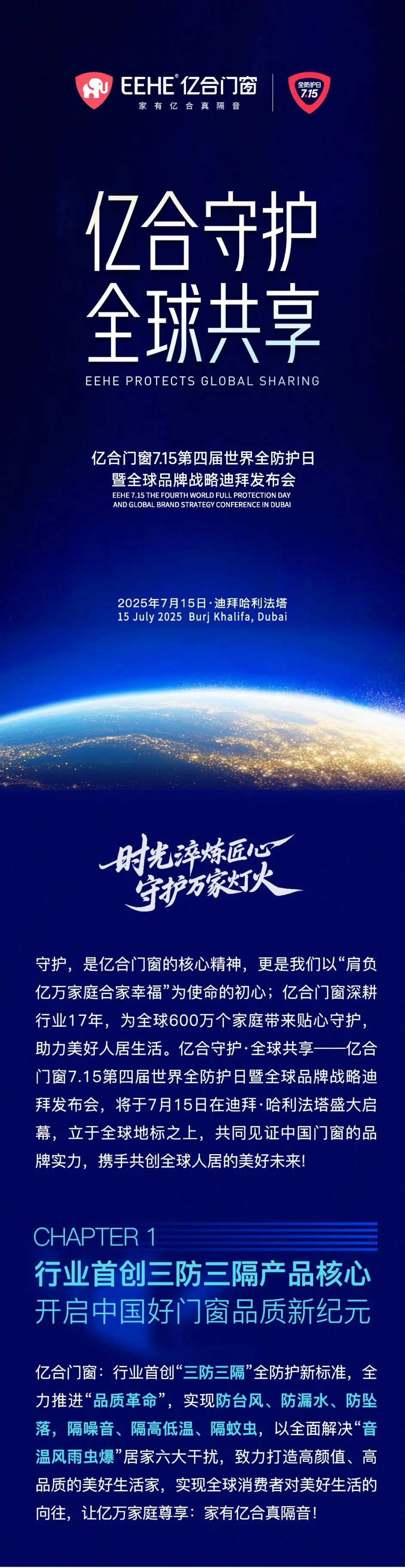 守護,是億合門窗的核心精神,更是我們以“肩負億萬家庭合家幸福”為使命的初心;億合門窗深耕行業17年,為全球600萬個家庭帶來貼心守護,助力美好人居生活。億合守護·全球共享--億合門窗7.15第四屆世界全防護日暨全球品牌戰略迪拜發布會,將于7月15日在迪拜·哈利法塔盛大啟幕,立于全球地標之上,共同見證中國門窗的品牌實力,攜手共創全球人居的美好未來!