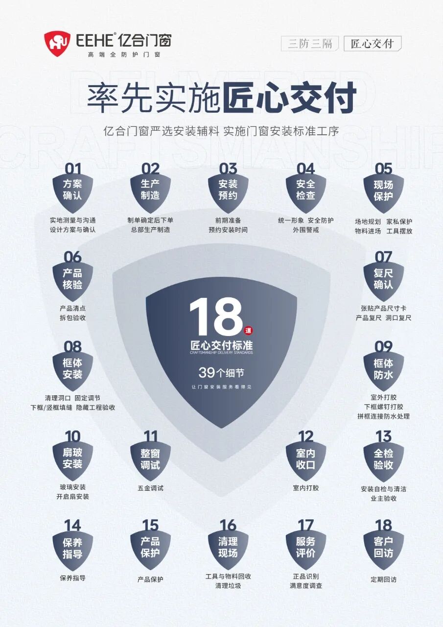 在安裝交付方面,億合門窗率先實施“匠心交付”服務體系。從前期上門測量、方案設計,到中期精準安裝、現場調試,再到后期定期維護、售后響應,都始終以“用戶為中心”,通過18道交付標準、39個質量細節,實現優質的產品與專業的安裝二者合一,彰顯品牌在交付服務上的領先實力與匠心精神。
