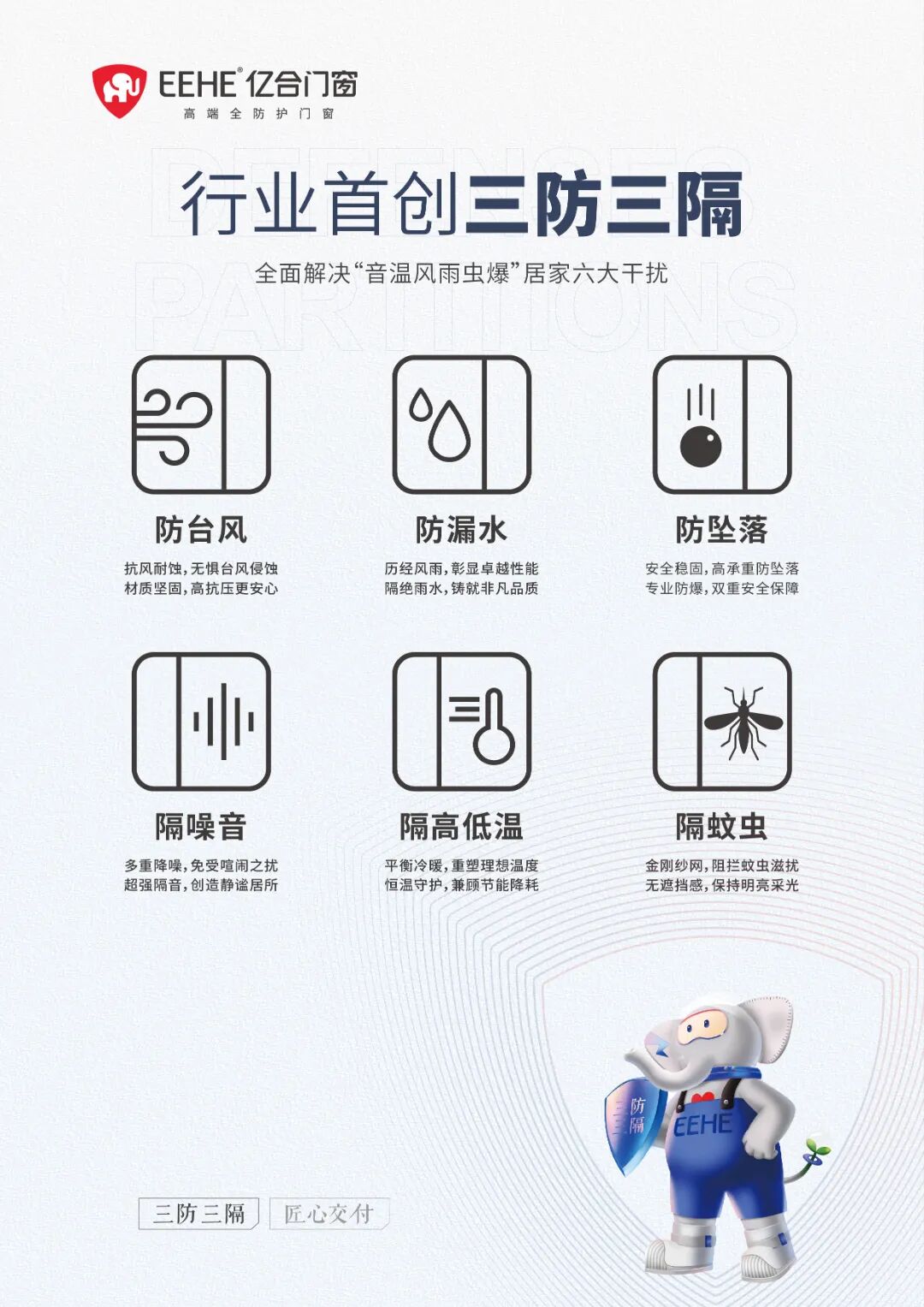 同時,億合門窗以創新為驅動,不斷提升產品品質與性能,行業首創“三防三隔”全防護新標準,實現防臺風、防漏水、防墜落,隔噪音、隔高低溫、隔蚊蟲的門窗性能,重新定義門窗的安全與舒適維度,以硬核實力引領行業品質升級,為用戶構筑更高標準的理想居所。