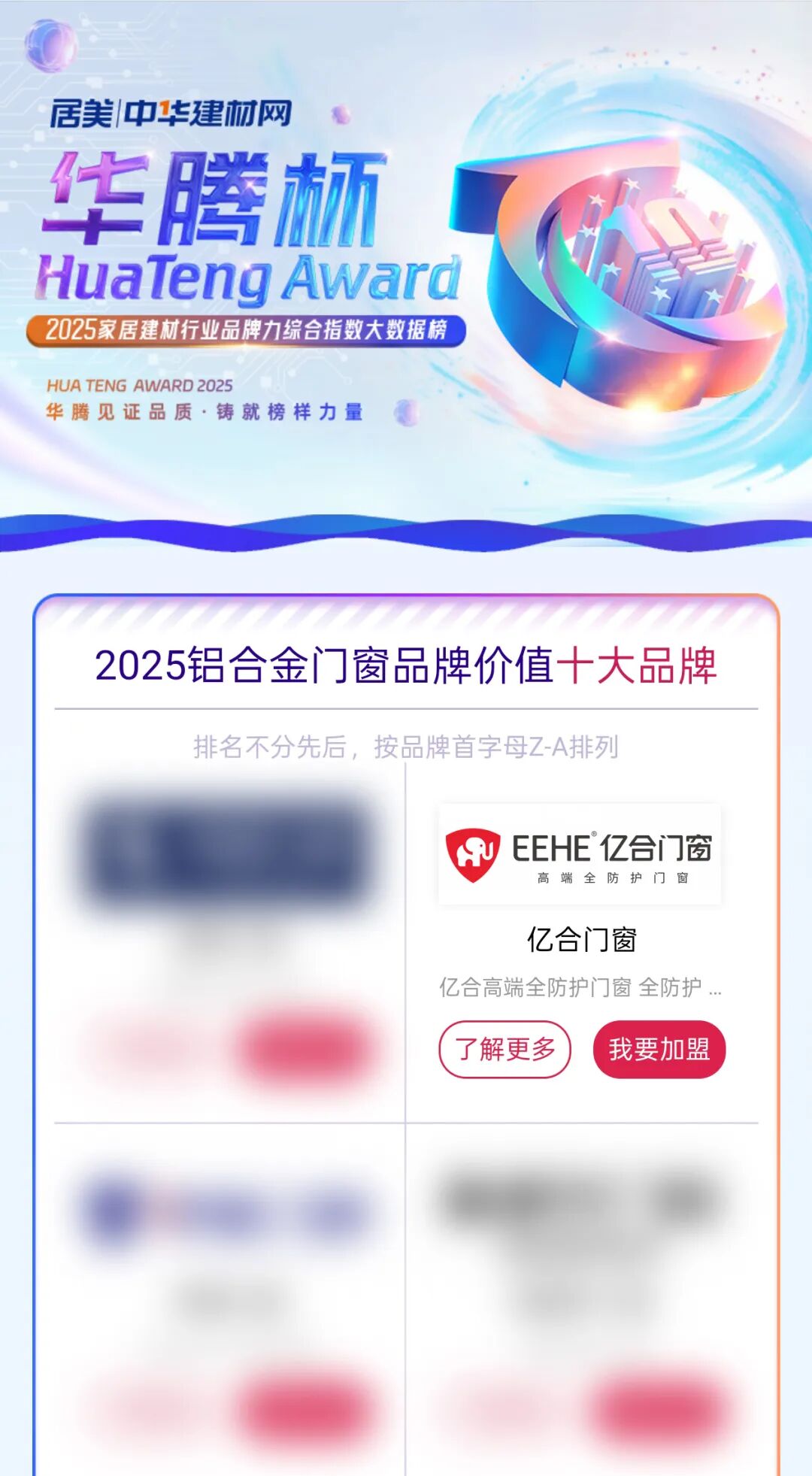 近日,由居美丨中華建材網主辦的“2025家居建材行業品牌力綜合指數大數據榜”榮耀揭幕。億合門窗憑借深厚的品牌積淀、硬核的產品實力與專業的交付服務,榮獲“鋁合金門窗品牌價值十大品牌”殊榮。這一榮譽不僅是行業對億合門窗綜合競爭力的高度認可,更印證了其跳出“價格內卷”、深耕“價值競爭”的戰略遠見,為中國門窗行業的高質量發展樹立典范。
