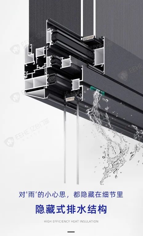 同時搭配隱藏式排水設(shè)計,依據(jù)等壓腔原理,保證水體的自由流動,杜絕倒灌現(xiàn)象,即使在暴雨天,也能使排水更加流暢,進(jìn)一步保證門窗的水密性。