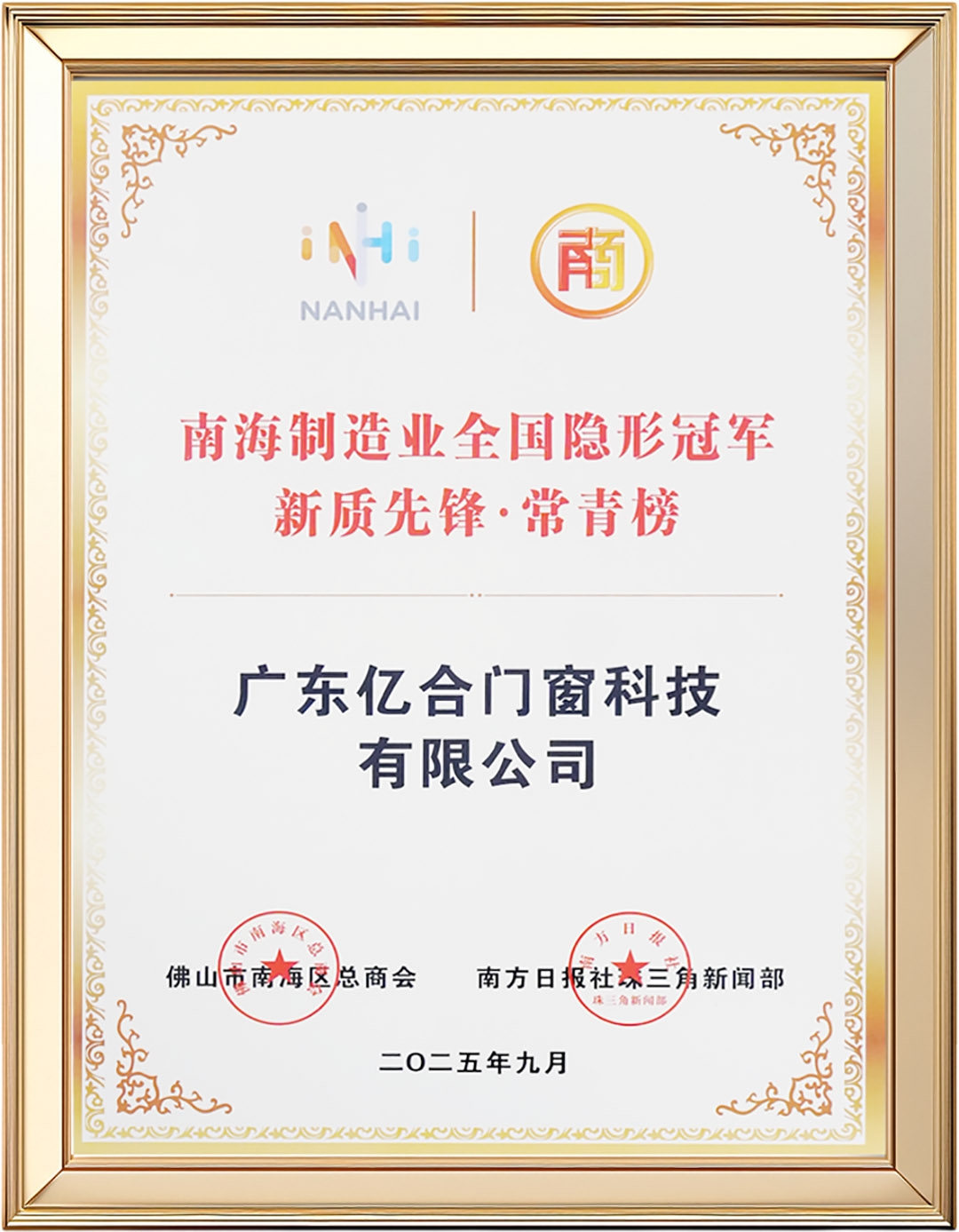 億合門窗榮登2025年“南海制造業(yè)全國(guó)隱形冠軍”新質(zhì)先鋒·常青榜,既是對(duì)過(guò)往發(fā)展成果的肯定與榮譽(yù)見(jiàn)證,更是對(duì)未來(lái)繼續(xù)深耕制造業(yè)、培育新質(zhì)生產(chǎn)力的鞭策與期許。未來(lái),億合門窗將繼續(xù)以“隱形冠軍”的堅(jiān)守與“新質(zhì)先鋒”的魄力,在技術(shù)創(chuàng)新上持續(xù)突破、在服務(wù)升級(jí)上不斷深化、在產(chǎn)業(yè)協(xié)同上積極作為,以更強(qiáng)的品牌實(shí)力、更優(yōu)的產(chǎn)品服務(wù),為南海制造業(yè)高質(zhì)量發(fā)展注入新動(dòng)能,為中國(guó)門窗行業(yè)的轉(zhuǎn)型升級(jí)樹(shù)立新標(biāo)桿!