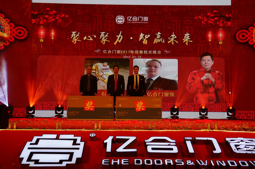 2017年1月12日,以“聚心聚力·智贏未來”為主題的“億合門窗2017年迎春聯歡晚會”在億合門窗科技園隆重舉行。突如其來的降溫絲毫沒有阻擋億合門窗家人喜迎新春的熱情,億合門窗董事長曾奎、常務副總經理胡超、副總經理吳忠用、億合門窗各大供應商、全國戰略合作伙伴部分代表及全體億合門窗家人共計1500余人一起歡聚一堂,為2016年畫下圓滿句號。