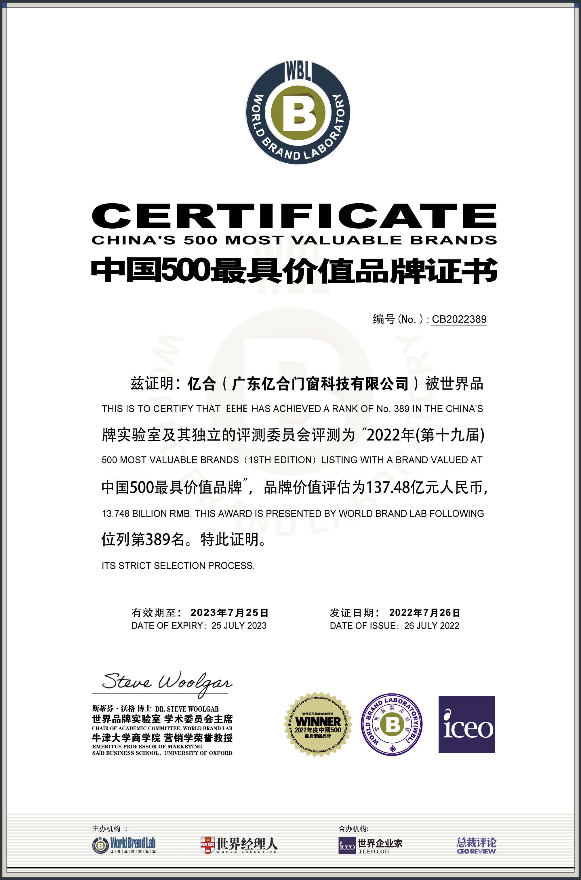 在這份基于品牌強度、財務(wù)數(shù)據(jù)和消費者行為分析的年度報告中,億合門窗以137.48億元品牌價值榮登本年度最具價值品牌389位,這是億合門窗連續(xù)五年邁進世界級品牌陣營,也是億合門窗連續(xù)第五次與國家電網(wǎng)、中國工商銀行、海爾、騰訊、中國人壽等品牌共同入選《中國500最具價值品牌》。