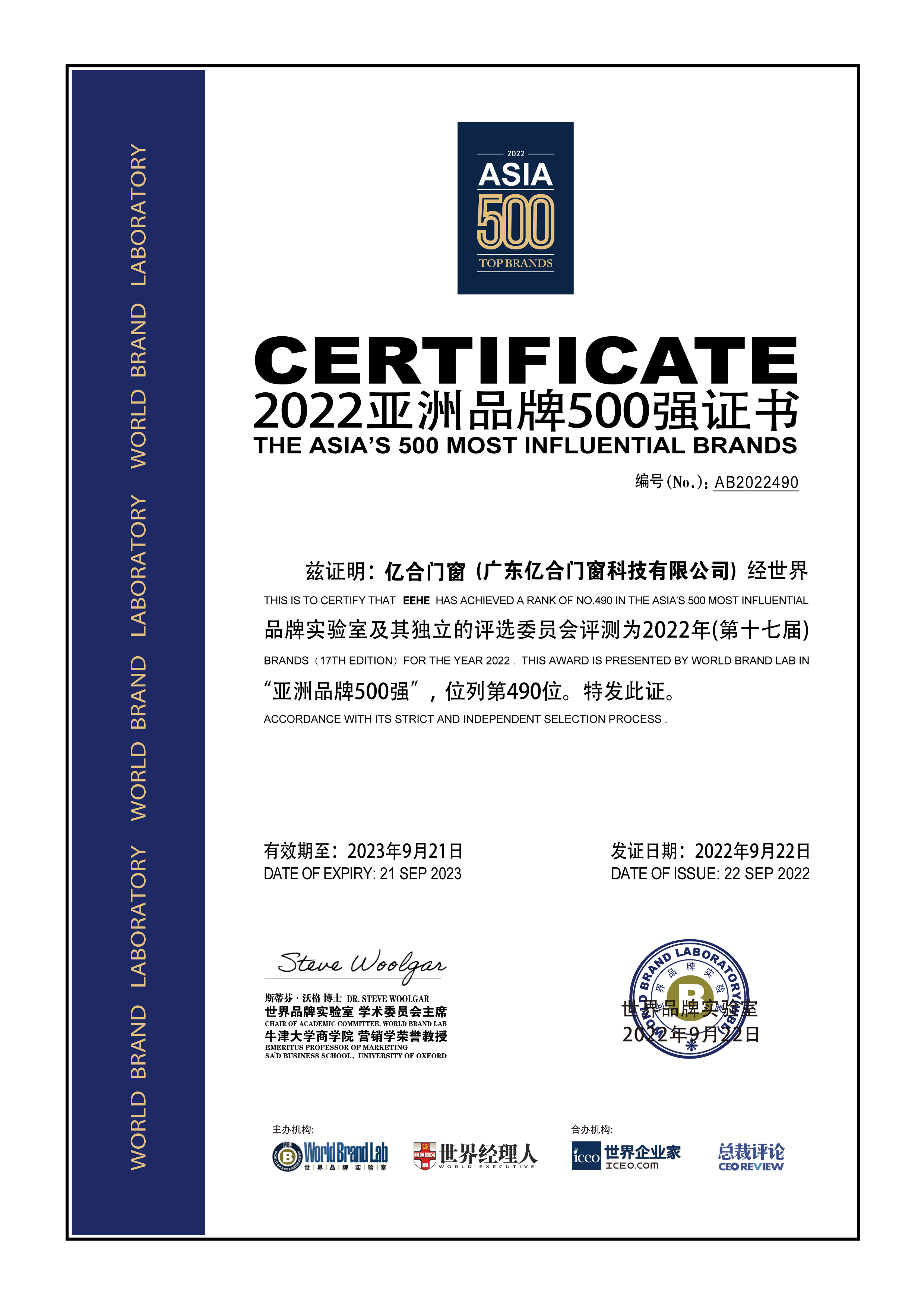 本次入選榜單,億合門窗與豐田、國家電網、騰訊、工商銀行、華為等500家企業共同跨入“亞洲品