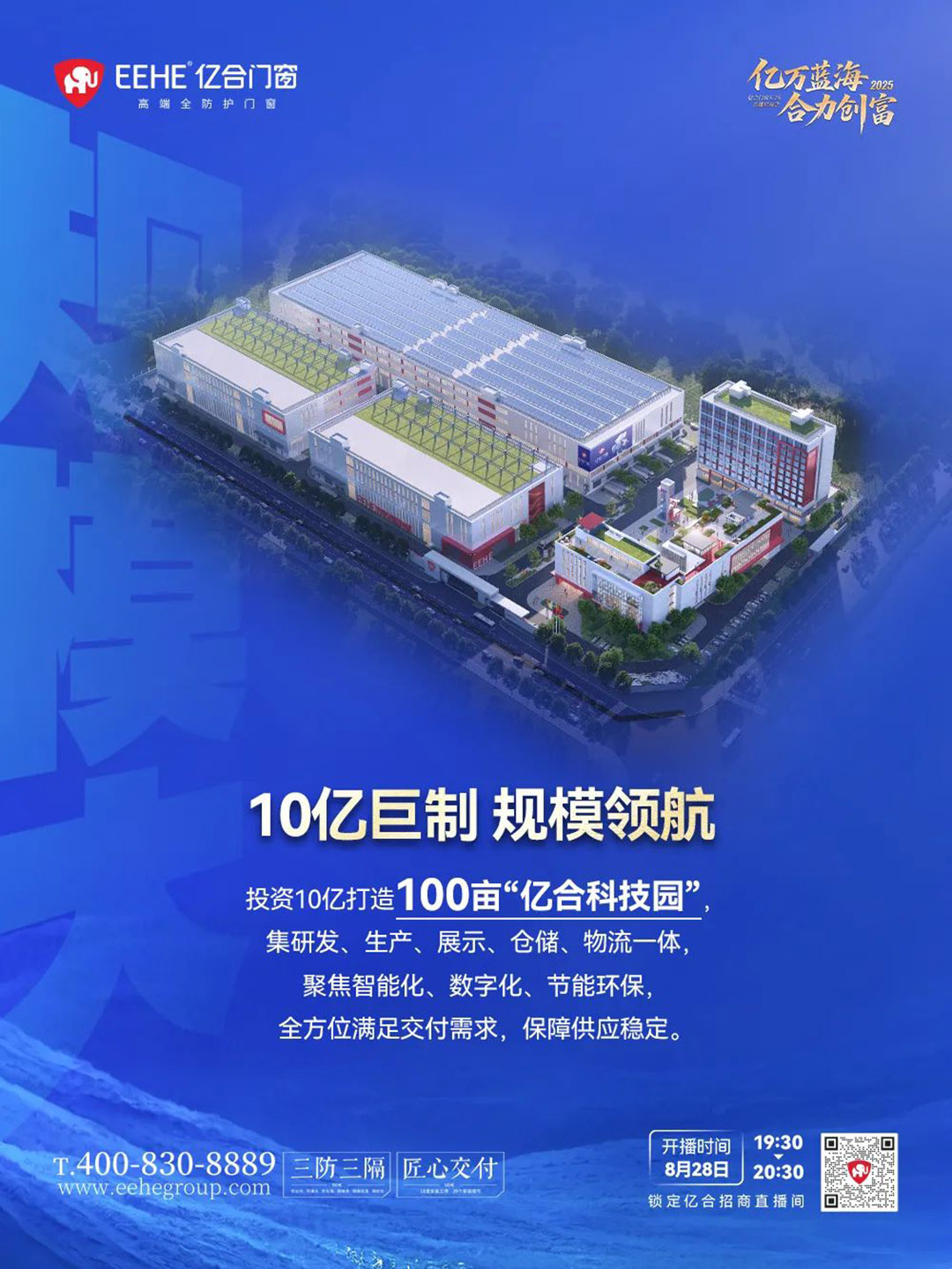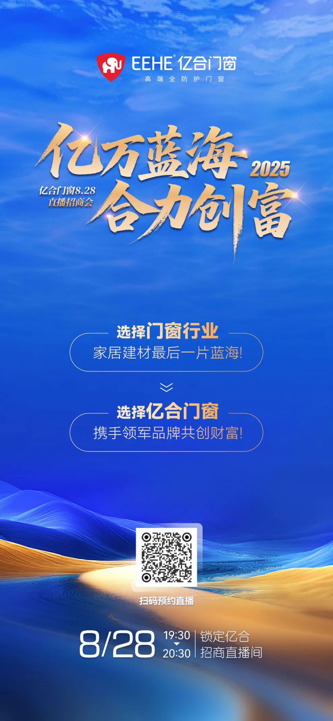 8月28日晚上19:30—20:30的直播招商會,將是一次不容錯過的財富機遇。在這場直播中,您將深入了解市場前景和億合門窗的品牌理念、產品優勢、加盟政策。無論您是初入行業的創業者,還是尋求轉型升級的門窗從業者,億合門窗都將為您提供一個實現財富夢想的平臺。抓住時代機遇,開啟全新財富之路,億合門窗誠邀您掃二維碼預約,提前鎖定“億合門窗”官方視頻號直播間,共同搶占萬億門窗市場,共創財富未來!