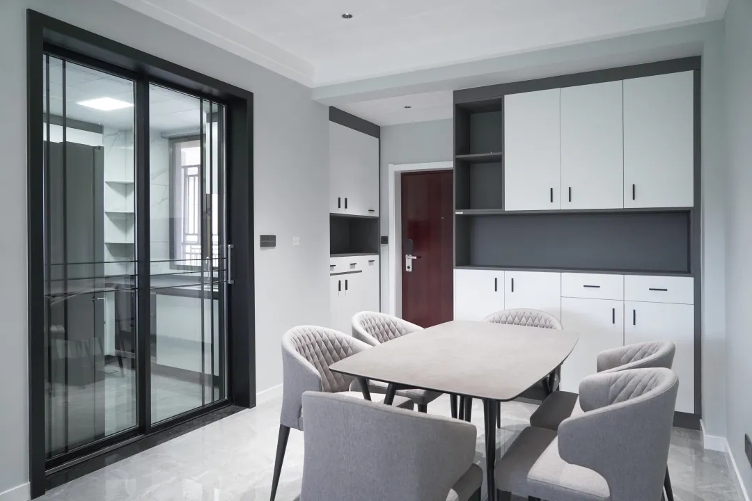 億合門窗極景推拉門,安裝在廚房具備了超高的顏值,外觀設計美觀大方,與室內極簡的風格相得益彰。衛生間選取極景平開門,簡而不凡的配色,搭配靈動的線條,特別符合現代極簡的風格。
