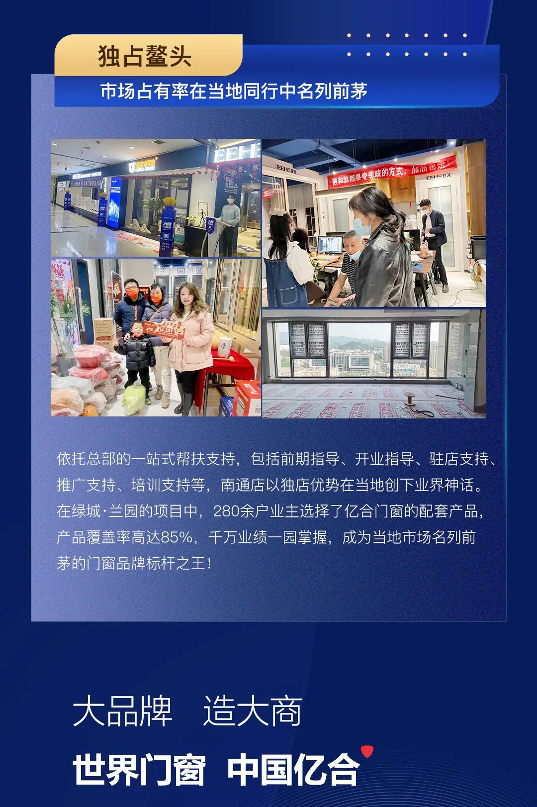 依托總部的一站式幫扶支持,包括前期指導、開業指導、駐店支持、推廣支持、培訓支持等,南通店以獨店優勢在當地創下業界神話。在綠城·蘭園的項目中,280余戶業主選擇了億合門窗的配套產品,產品覆蓋率高達85%,千萬業績一園掌握,成為當地市場名列前茅的門窗品牌標桿之王。